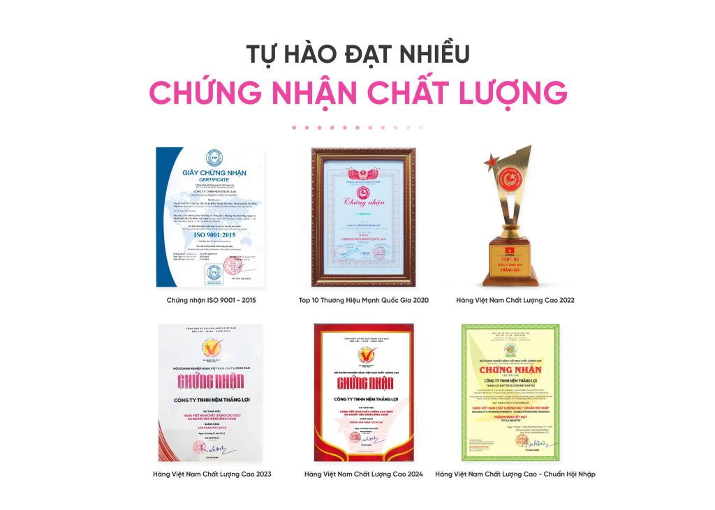 Từ một doanh nghiệp nhỏ, nhờ sự nỗ lực hết mình của toàn thể cán bộ công nhân viên; sự kề vai sát cánh của quý khách hàng, quý đối tác; cùng tầm nhìn chiến lược rõ ràng của Ban lãnh đạo, quan điểm phát triển bền vững và khát vọng vươn xa, Nệm Thắng Lợi đã không ngừng trưởng thành và lớn mạnh. Trong gần 10 năm năm qua, Công ty TNHH Nệm Thắng Lợi vinh dự nhận được nhiều giải thưởng, chứng nhận danh giá như “Top 10 Thương hiệu mạnh quốc gia 2020”; “Hàng Việt Nam Chất Lượng Cao được người tiêu dùng bình chọn” ba năm liên tiếp 2022 – 2024; “Hàng Việt Nam Chất Lượng Cao – Chuẩn Hội Nhập”,… Điều này là minh chứng cho những nỗ lực không ngừng nghỉ của Nệm Thắng Lợi trong việc đem đến cho người Việt những sản phẩm phụ vụ giấc ngủ chất lượng.