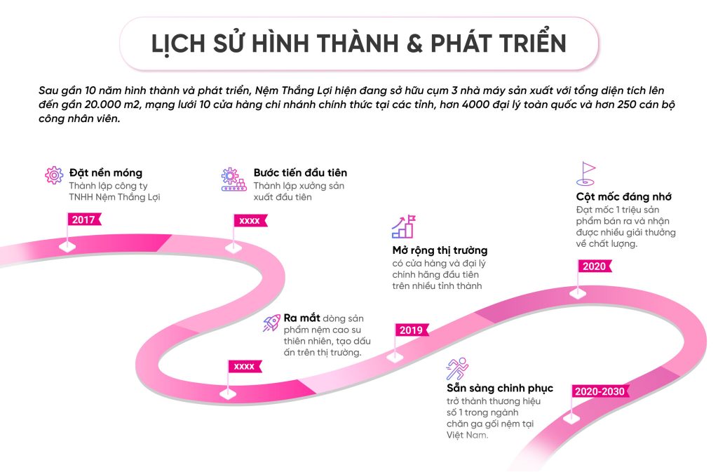 Công ty TNHH Nệm Thắng Lợi được thành lập vào ngày 22/02/2017 với mục tiêu mang đến giấc ngủ chất lượng cho hàng triệu gia đình Việt. Sau gần 10 năm hình thành và phát triển, Nệm Thắng Lợi hiện đang sở hữu cụm 3 nhà máy sản xuất với tổng diện tích lên đến gần 20.000 m2, mạng lưới 10 cửa hàng chi nhánh chính thức tại các tỉnh, hơn 4000 đại lý toàn quốc và hơn 250 cán bộ công nhân viên.