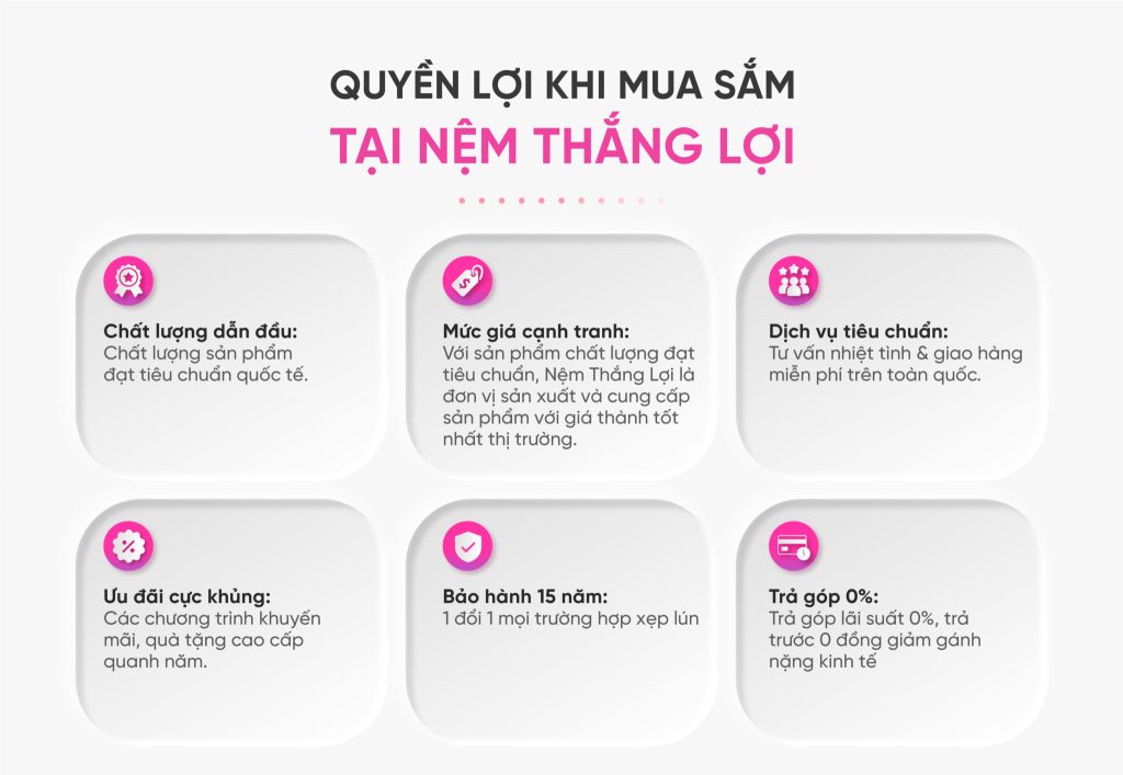 Công ty TNHH Nệm Thắng Lợi là một thương hiệu uy tín và lâu đời trong ngành sản xuất và kinh doanh các sản phẩm chăn ga gối nệm tại Việt Nam. Với cam kết về chất lượng và sự đổi mới không ngừng, Nệm Thắng Lợi đã khẳng định vị thế của mình qua việc cung cấp các sản phẩm chất lượng cao, đáp ứng nhu cầu đa dạng của người tiêu dùng. Nệm Thắng Lợi đã chiếm trọn niềm tin của người tiêu dùng qua nhiều năm hoạt động.