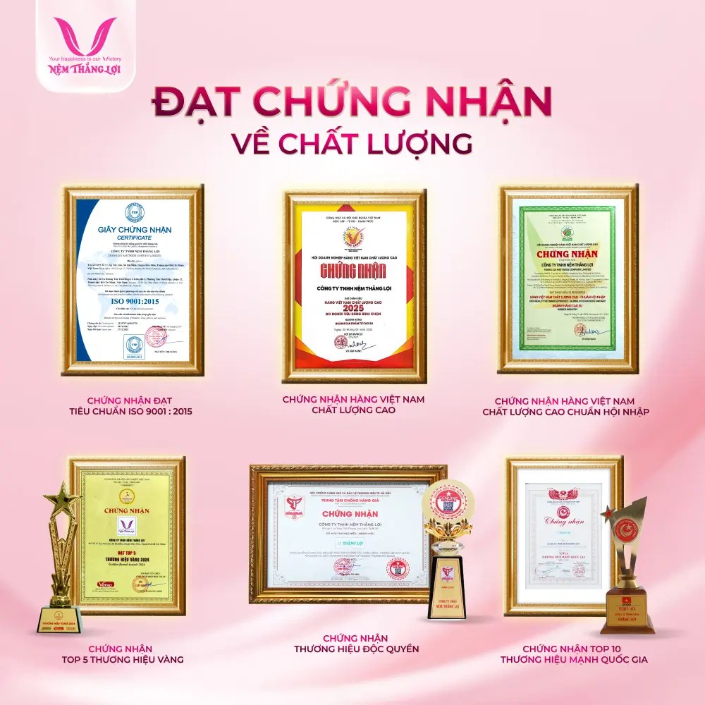 Nệm Thắng Lợi cam kết cung cấp các sản phẩm chất lượng cao, an toàn cho sức khỏe người dùng. Chúng tôi luôn đặt lợi ích của khách hàng lên hàng đầu, đảm bảo sự hài lòng và tin tưởng khi sử dụng sản phẩm. Với uy tín đã được khẳng định, Thắng Lợi tự hào là địa chỉ hàng đầu cho những ai tìm kiếm nệm điều hòa chính hãng, an toàn và đáng tin cậy. Mỗi sản phẩm của Nệm Thắng Lợi đảm bảo chất lượng vượt trội mà còn mang đến sự an tâm tuyệt đối với nguồn gốc rõ ràng, những chứng nhận liên tục nhận được trong năm qua.
