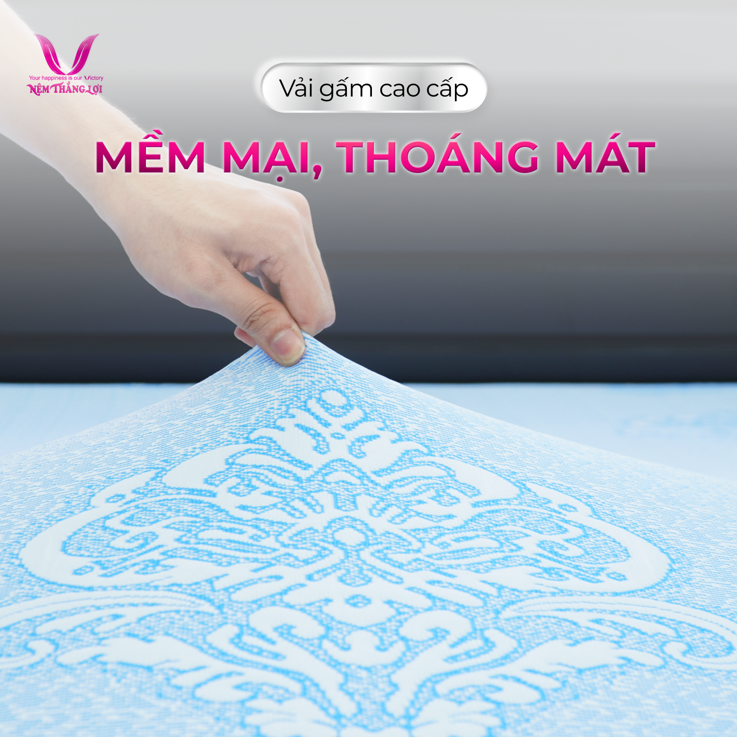 Áo nệm của Nệm Cao Su Thiên Nhiên Rosi Thắng Lợi sử dụng vải gấm cao cấp, mềm mại với thiết kế thông minh, đảm bảo sự bền đẹp và thoáng mát.